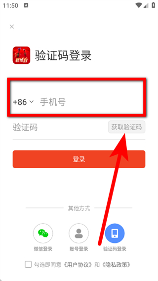 3、在验证码登录页面,输入手机号,点击获取验证码。