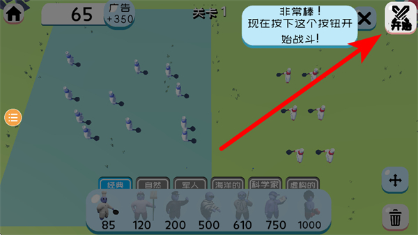 4、完成单位部署后,点击开始按钮启动战斗,让己方单位与敌方单位对战。
