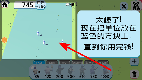 3、消耗资金,将下方的单位放置在蓝色方块区域,直到用完当前可用资金。
