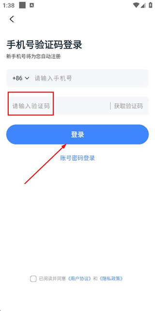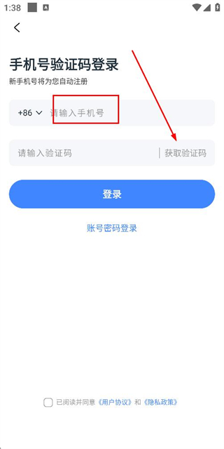 2、在登录页面填写手机号,勾选协议后,点击获取验证码。