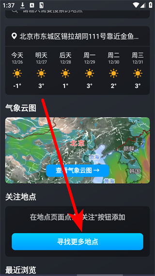 1、打开新知卫星云图,在首页点击寻找更多地点,进入地点搜索界面。