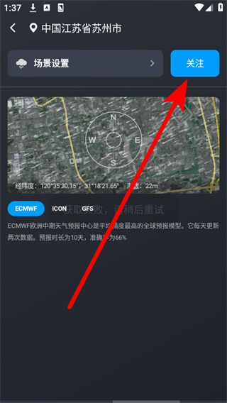 4、在城市页面右上角点击关注,即可完成该城市地图的添加。
