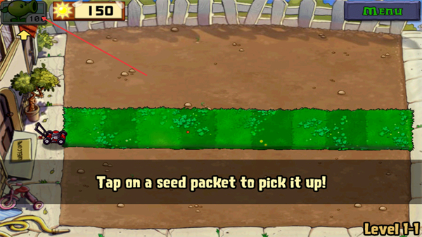 2、这是游戏的1-1关卡,你需要先点击左上角的PeaShooter种子包来选中它,这样才能在下方的草坪区域种植该植物,种植植物是抵御僵尸的基础步骤。
