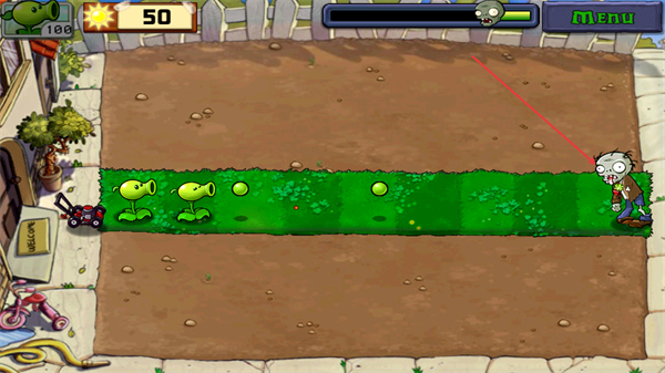 4、当僵尸出现后,你种植的PeaShooter会自动发射豌豆攻击僵尸,你需要确保种植足够的植物来阻挡僵尸前进,若僵尸靠近则会突破防线导致关卡失败。