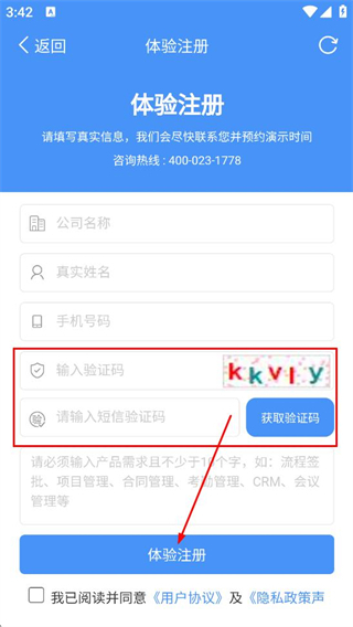 3、在体验注册页面,依次填写公司名称、真实姓名、手机号码对应的内容。