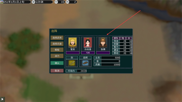 4、进入出阵界面,选择武将、兵种配置兵力,准备出战。