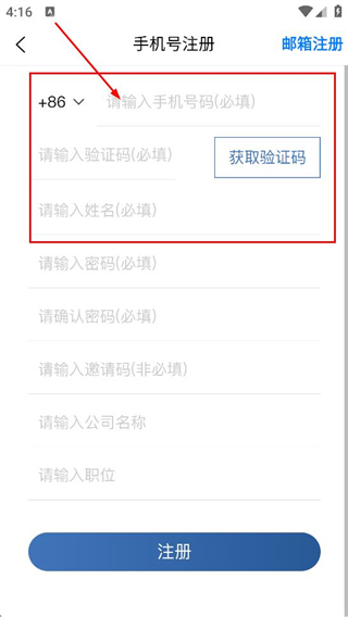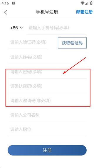 3、在手机号注册页面,继续填写请输入密码、请确认密码,可按需填写请输入邀请码。