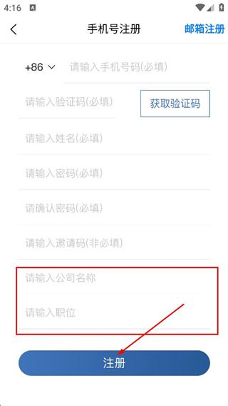 4、在手机号注册页面,填写公司名称、请输入职位后,点击注册的按钮完成注册操作。