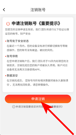 3、在注销账号页面,阅读页面内容,点击申请注销。