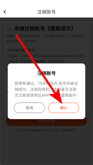 4、在弹出注销帐号确认弹窗,点击确认,提交注销申请。