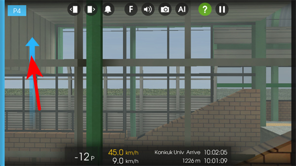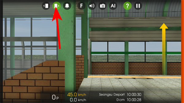 2、游戏中依照红色箭头指引,操作顶部的控制按钮启动列车,同时观察界面显示的速度、站点等信息,把控运行节奏。