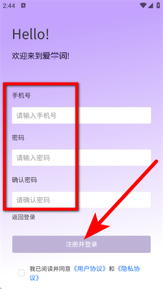 4、在注册界面,输入手机号和设置密码,点击注册并登录,完成账号注册。