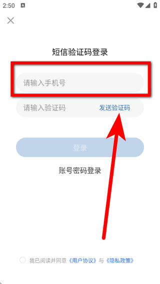 3、在短信验证码登录页面,输入手机号,点击发送验证码。