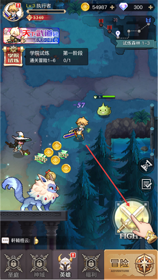 1、这是游戏主界面,点击右下角的FIGHT按钮,可进入战斗相关流程,界面同时显示学院试炼等任务及资源信息。