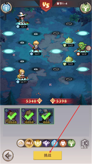 2、进入章节1-4的战斗准备界面,确认已选阵容后,点击下方的挑战按钮,即可开启当前章节的战斗关卡。