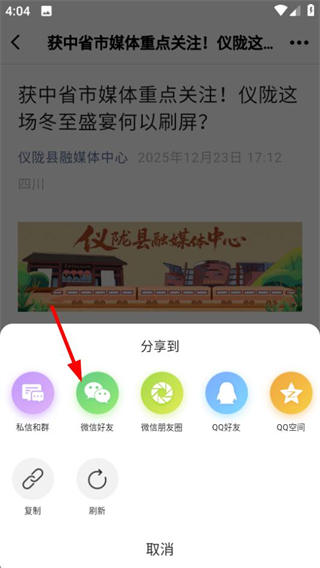 3、在分享菜单中,选择目标分享渠道,即可将该新闻内容分享出去。