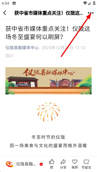 2、在新闻详情页面,点击右上角的三点按钮,可弹出分享选项菜单。