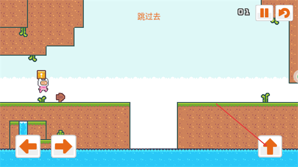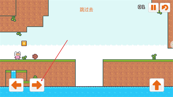 2、当前关卡界面显示跳过去提示,需点击下方右侧的向右箭头,按钮控制角色向右移动,靠近需要跳跃的区域。