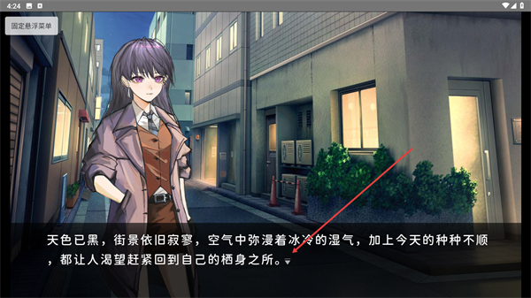 2、当前界面显示场景描述文字阅读完后,需点击文字右侧的向下箭头按钮,推进剧情进入后续游戏内容。