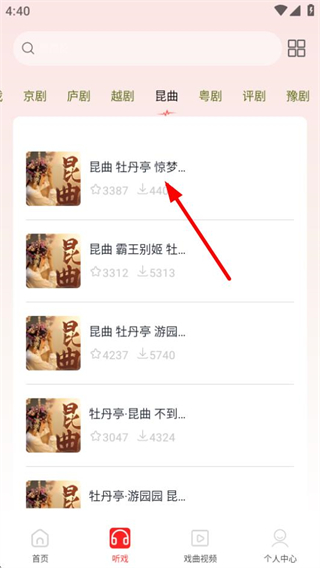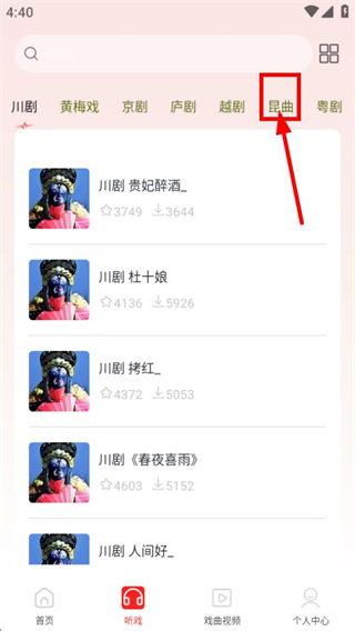 2、在听戏页面,点击目标戏曲分类标签,可切换到对应分类的戏曲列表。