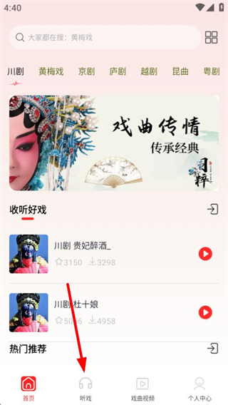 1、进入看戏曲逛梨园后,点击底部的听戏选项,可进入听戏页面。
