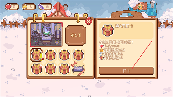 4、进入打卡界面后,找到第1天打卡对应的区域,点击打卡按钮即可领取当日对应的游戏奖励。