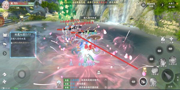 3、遇到妖魔入侵时会进入战斗状态,开启自动挂机功能,角色会自动攻击敌方目标,推进战斗进度。