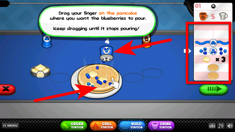 1、在制作界面拖动蓝莓装置至煎饼处,持续拖动完成配料添加。