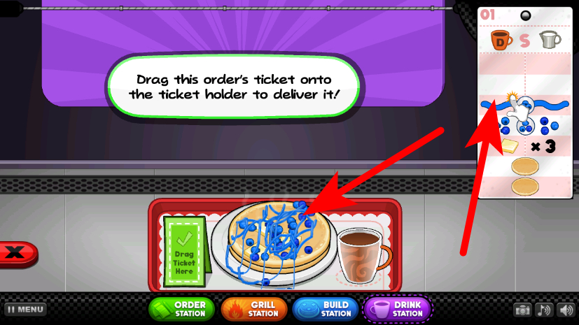 3、将订单票据拖动至票据架处,完成餐食配送的准备步骤。