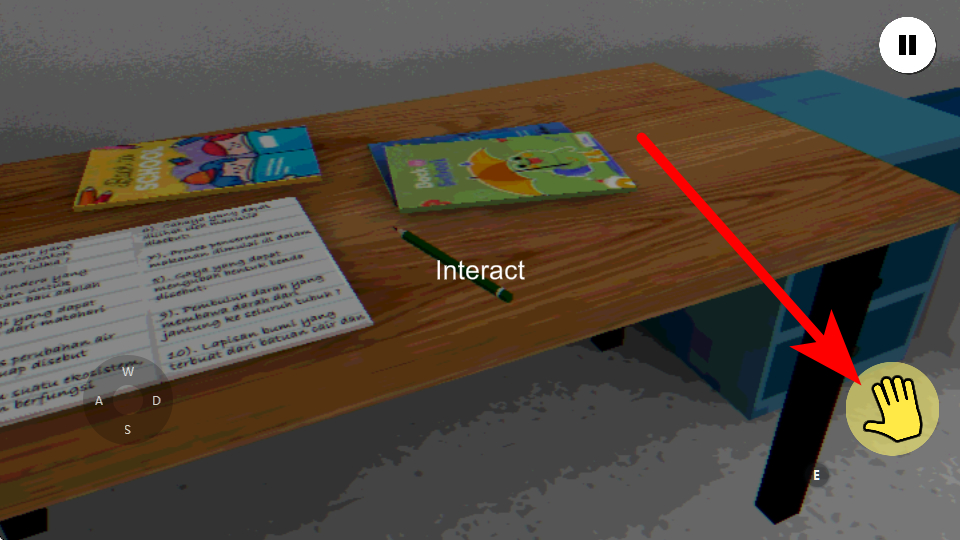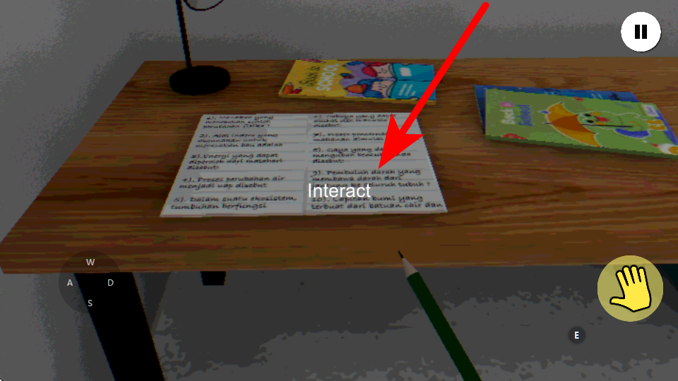 1、在场景中看到Interact提示时,点击互动按键,与桌上的铅笔进行交互,触发后续流程。