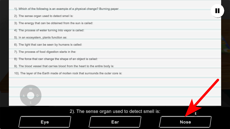 4、接着我们需要处理第二题嗅觉对应的感官器官,选择Nose鼻子选项,完成这一题的选择。