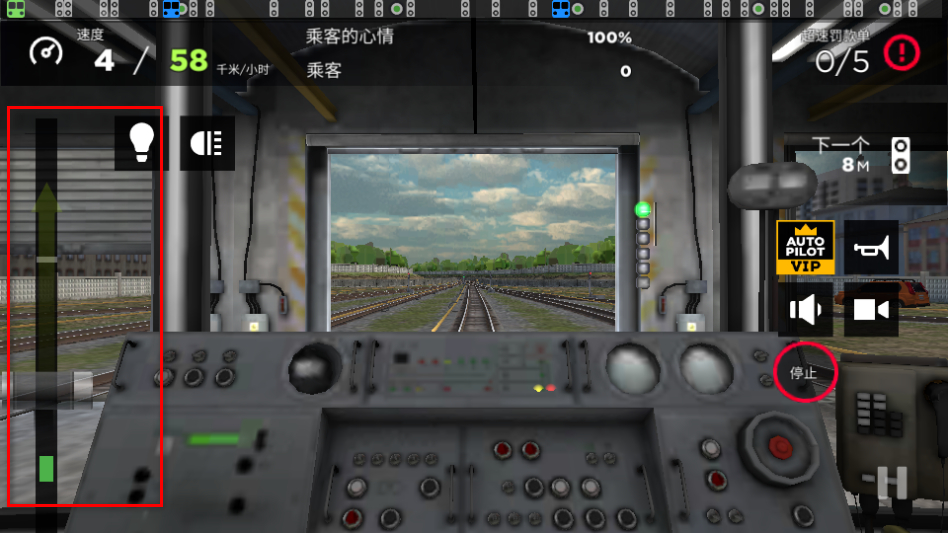 2、进入驾驶舱后,通过左侧的操控杆控制地铁速度,留意当前速度与限速如58/70千米/小时的匹配。