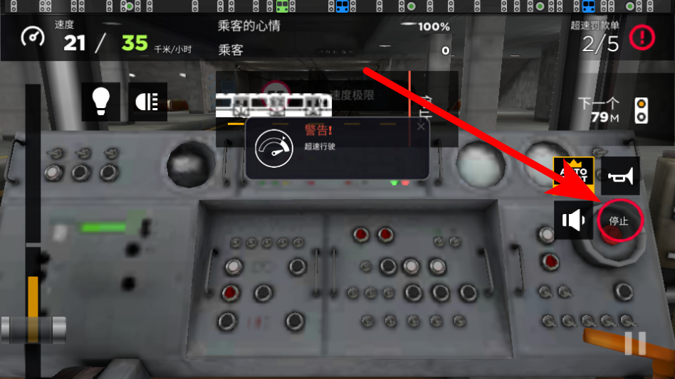 4、到达站点前,点击停止按钮控制地铁减速停靠,完成站点的乘客上下车流程。