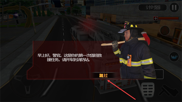 2、进入任务后会弹出任务提示框,点击跳过按钮可快速关闭提示,直接进入消防车驾驶环节。