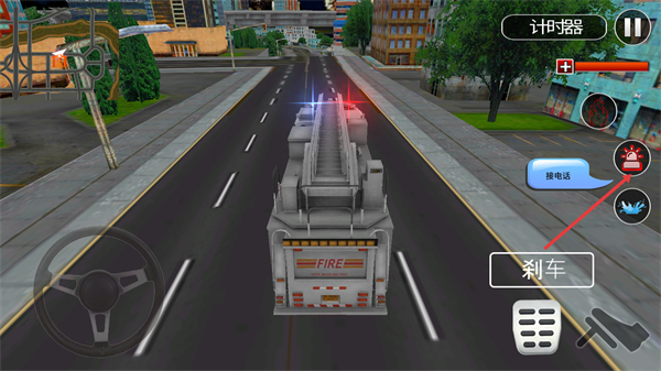 3、可点击右侧警灯按钮开启警示灯,接到任务后按照指引驾驶消防车前往火灾现场。