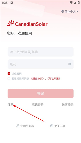 1、在阿特斯智慧能源的登录页,点击页面中的注册按钮,进入账号注册流程。