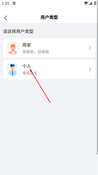 2、进入用户类型选择页,页面显示商家和个人选项,选择个人选项,进入注册界面。