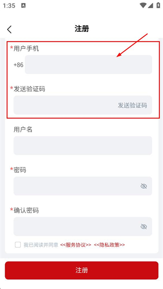 3、在注册页的对应区域,填写用户手机信息,再点击发送验证码,获取所需的验证信息。