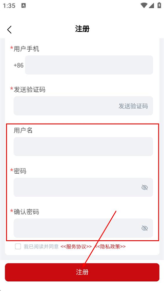 4、在注册页,继续填写用户名、密码、确认密码后,点击注册按钮,完成账号注册。