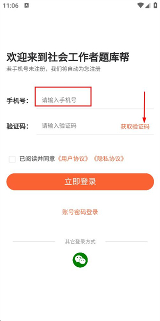 2、在登录页面填写手机号,勾选协议后,点击获取验证码。