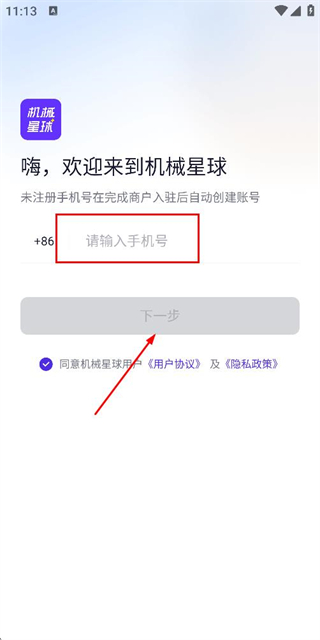 2、在登录页面填写手机号,勾选协议后,点击下一步获取验证码。