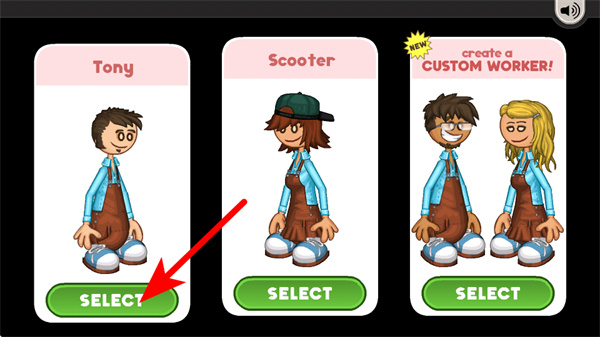2、在角色选择界面,依照红色箭头指引,点击SELECT按钮选择初始员工,确定店铺的操作角色。
