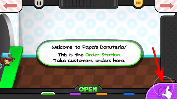 3、进入店铺后,紧跟红色箭头指引,点击右侧按钮开启做食物,进入订单站接收顾客的甜甜圈订单。