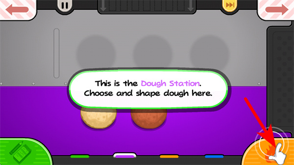 4、后续依照红色箭头指引,切换到面团站,选择并塑形面团,为制作甜甜圈准备基础原料。