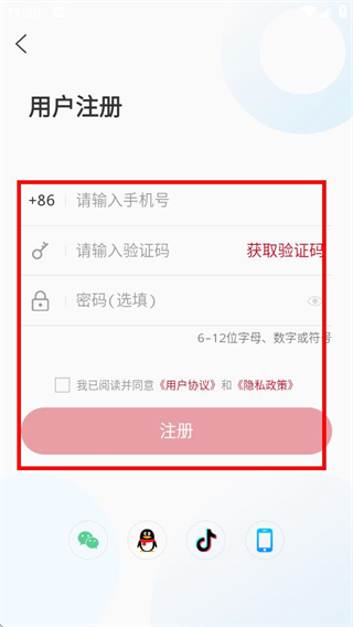 4、在注册页面,填写信息并勾选协议后,点击注册按钮即可完成账号注册。