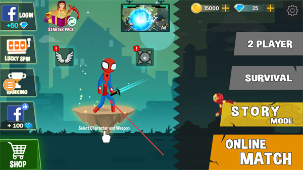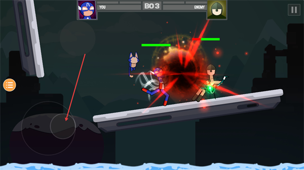 游戏以侧面视角呈现,两名火柴人角色相对而立进行战斗,通过虚拟按钮和手势操作来进行攻击、防守和闪避。每个火柴人角色都拥有独特的技能树,涵盖快速攻击、强力打击和跳跃技巧等,玩家需灵活运用这些技能。游戏内包含各式各样的武器和工具,例如拳套、棍子、炸药等,这些都能提升战斗策略和娱乐性。