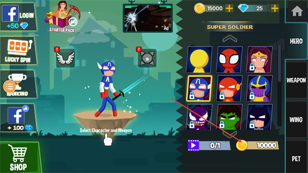 2、进入角色选择界面后,在SUPERSOLDIER分类下选可用角色,部分角色可消耗10000金币解锁,选好后即可进入战斗环节。