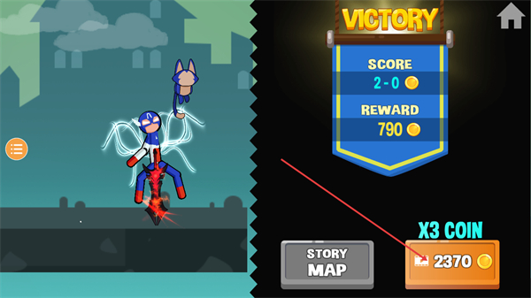 4、战斗胜利后显示VICTORY界面,可查看SCORE2-0战绩与REWARD790奖励,也可选获三倍金币后返回主界面。