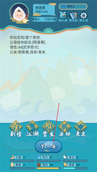 2、点击下一年,推进角色年龄增长,解锁后续事件。