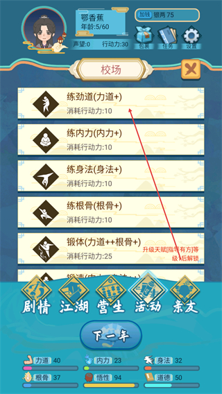4、进入校场界面,消耗行动力选择训练项目,提升力道等属性。